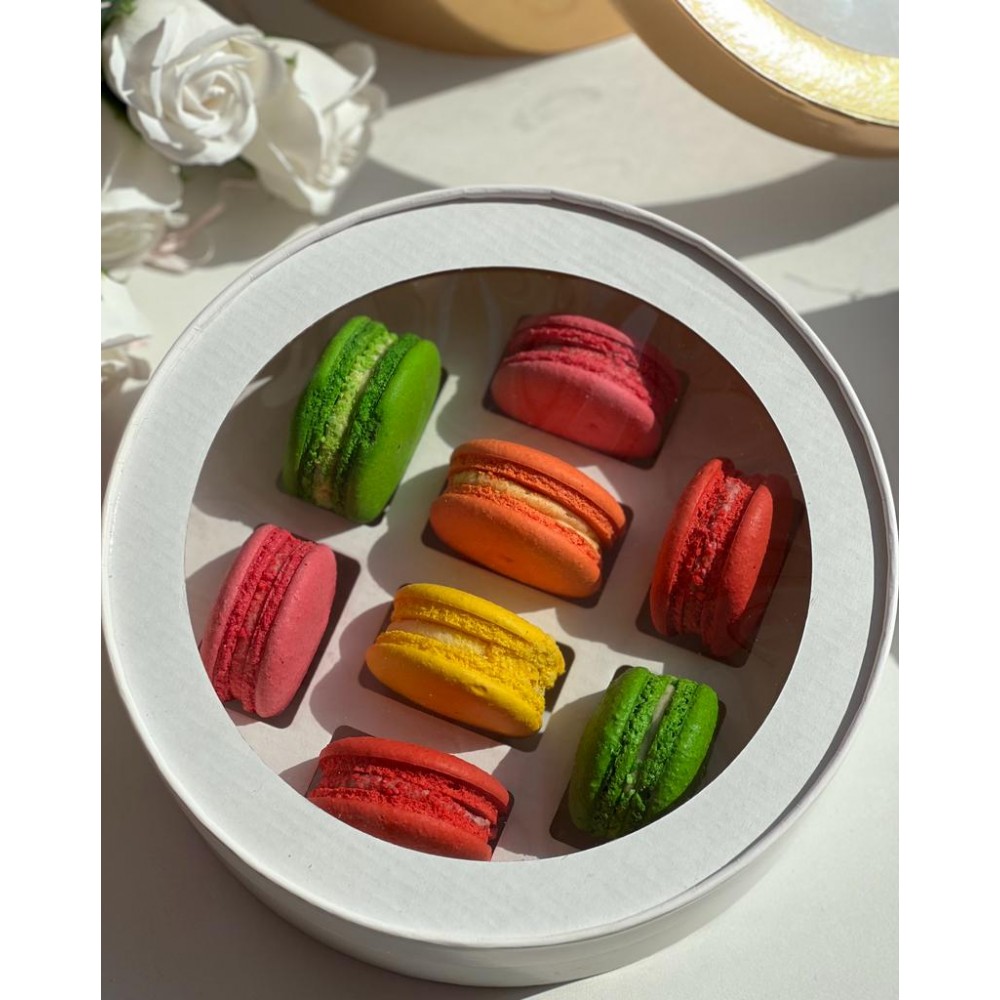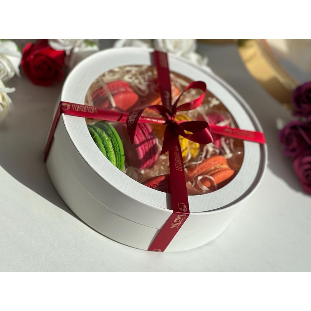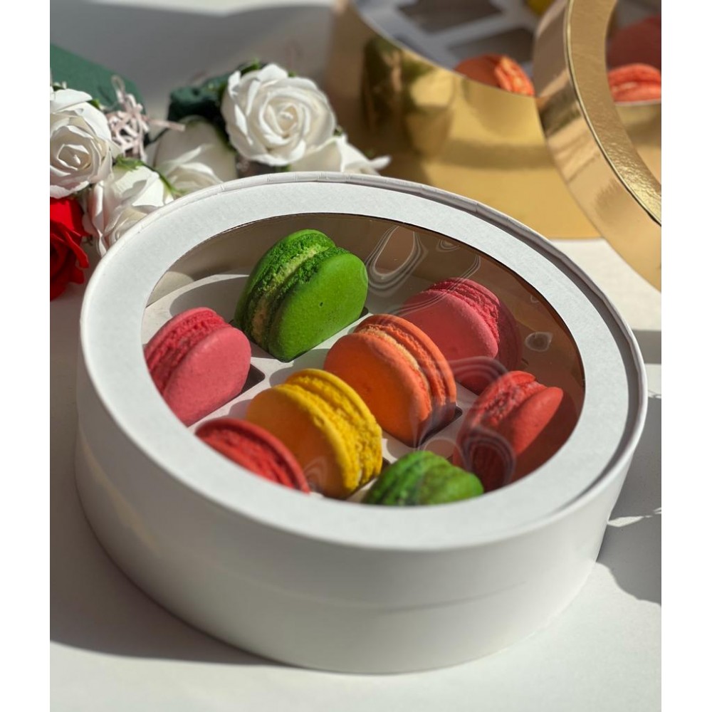 Коробка белая круглая ( шляпная) на 8 макарон, диаметром 200 мм, высотой 60 мм, с окном и ложементом, 1 шт