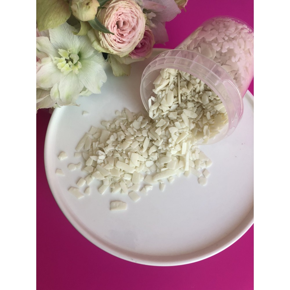 Осколки неправильной формы размером 5-7мм, вкус, цвет, аромат и консистенция свойствены белому шоколаду.
