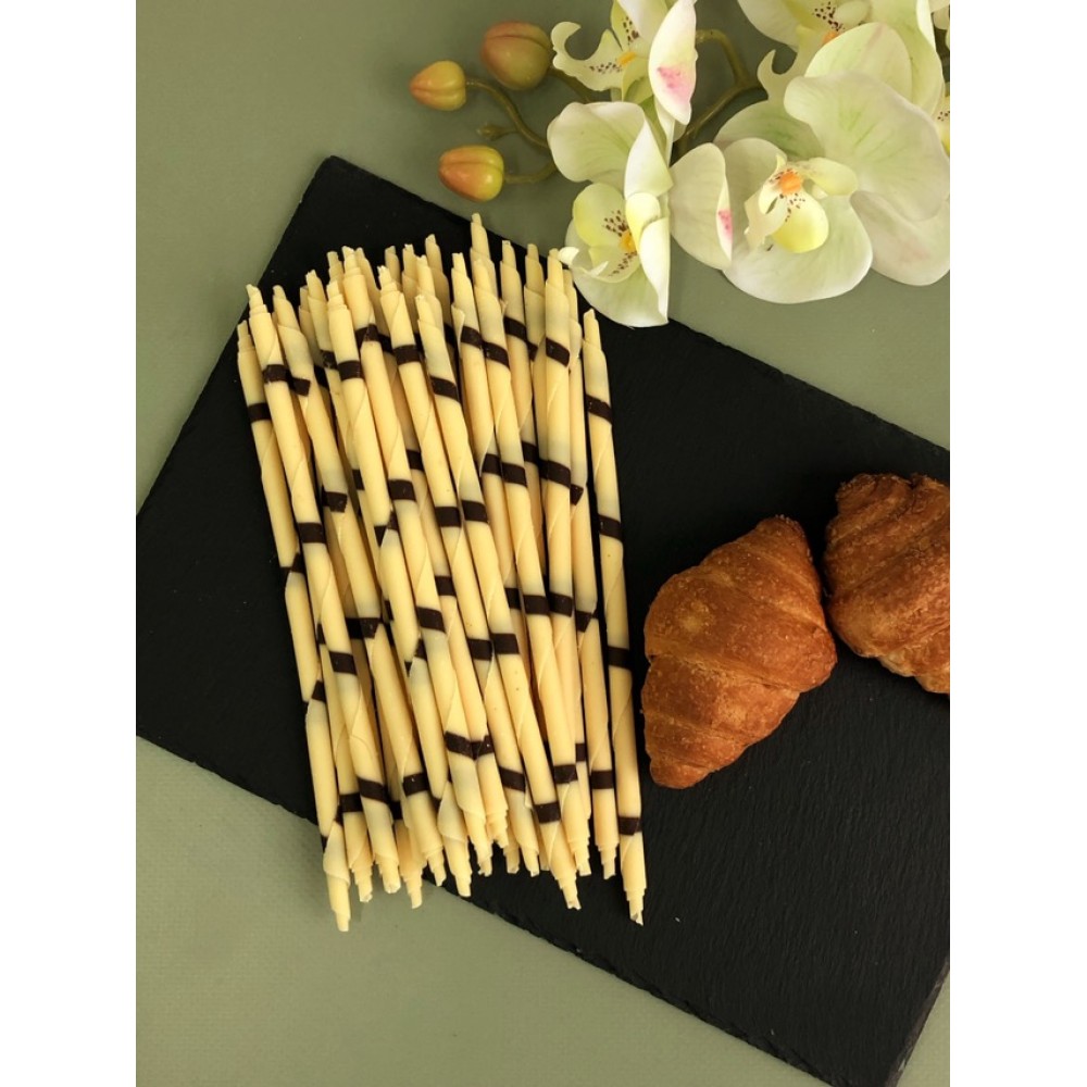 Кондитерское украшение из белого и темного шоколада в виде скрученной трубочки длиной 20 см, с содержанием какао-продуктов 29,3-32,2%